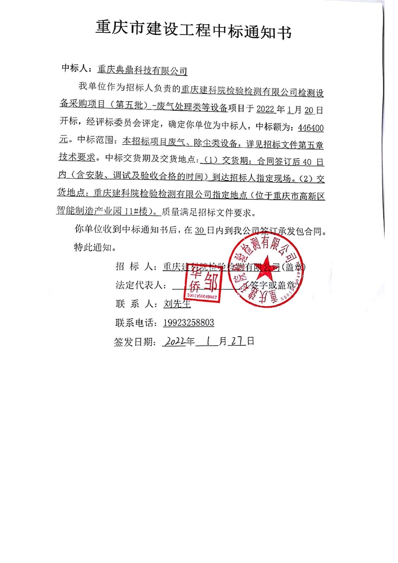 重慶建科院檢驗檢測有限公司委托重慶市工程管理有限公司對我公司檢測設備采購項目(項目號:CQEM-ZB-22002 )重慶建科院檢驗檢測有限公司檢測設備采購項目(第五批)-廢氣處理類等設備進行了公開招標采購,現已完成全部采購程序。確認重慶典鼎科技有限公司為檢測設備采購項目(第五批)-廢氣處理類等設備采購項目中標人,中標價為446400元(大寫:肆拾肆萬陸仟肆佰元整)。