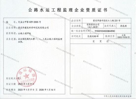 近日,經交通運輸部核準,重慶設計集團市建科院公司申請重新核定的公路工程監理甲級資質成功獲批并順利取證。