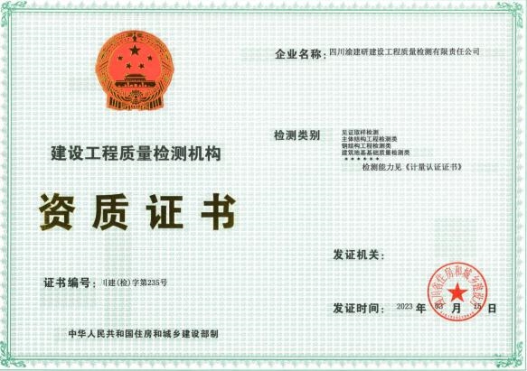 近日,經(jīng)四川省住房和城鄉(xiāng)建設(shè)廳核準,重慶設(shè)計集團市建科院所屬子企業(yè)四川渝建研建設(shè)工程質(zhì)量檢測有限責(zé)任公司(以下簡稱“渝建研”)申請重新核定的建設(shè)工程質(zhì)量檢測機構(gòu)資質(zhì)于2023年3月成功獲批并順利取證。