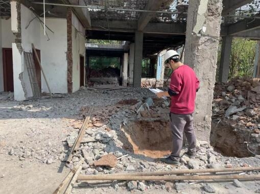 4月初,業(yè)主單位在拆除朝華書院項(xiàng)目裝修結(jié)構(gòu)并開挖基礎(chǔ)時(shí),發(fā)現(xiàn)實(shí)際情況與前期鑒定報(bào)告中基礎(chǔ)及結(jié)構(gòu)部分不符,施工圖設(shè)計(jì)單位無法進(jìn)行后續(xù)設(shè)計(jì)及指導(dǎo)現(xiàn)場(chǎng)施工,導(dǎo)致項(xiàng)目無法推進(jìn),亟需具有權(quán)威性及專業(yè)性的單位對(duì)房屋結(jié)構(gòu)進(jìn)行全面檢測(cè),并繪制現(xiàn)場(chǎng)實(shí)際結(jié)構(gòu)圖。市建科公司對(duì)此類無圖紙或圖紙信息不符的既有房屋檢測(cè)鑒定有豐富經(jīng)驗(yàn),能夠迅速組織專家組對(duì)房屋進(jìn)行診治,做到對(duì)癥施治,切實(shí)消除安全隱患。接到委托后,公司專家組立即趕赴現(xiàn)場(chǎng)開展檢測(cè)工作,頭頂驕陽汗如雨,不懼“烤”驗(yàn)趕工,經(jīng)過十余天的艱苦奮戰(zhàn)完成現(xiàn)場(chǎng)檢測(cè)工作,轉(zhuǎn)入數(shù)據(jù)統(tǒng)計(jì)及繪制圖紙的室內(nèi)工作中。