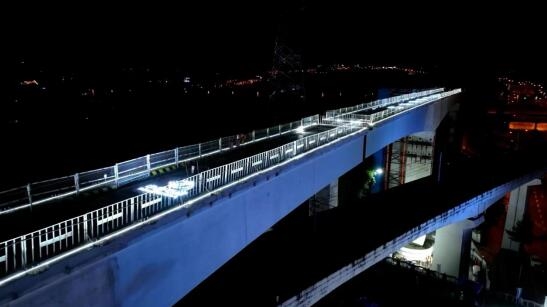 為最大程度減少對運營線路的影響,縮短建設工期,保障施工安全,項目部決定采用橋梁轉體工藝進行施工,即在6號線兩側將T構連續梁澆筑完成,以橋墩為軸逆時針轉體,跨越既有6號線進行對接。7月28日1時56分,6號線東延工程劉家坪站至百樂園站高架區間的兩座T構連續梁轉體橋開始轉體施工,經過52分鐘的轉體作業后,實現精準對接,這既是6號線東延工程高架區間首座連續梁轉體,也是重慶軌道交通領域首次實現連續梁跨越既有軌道交通線路轉體,為后續類似施工提供了范本。